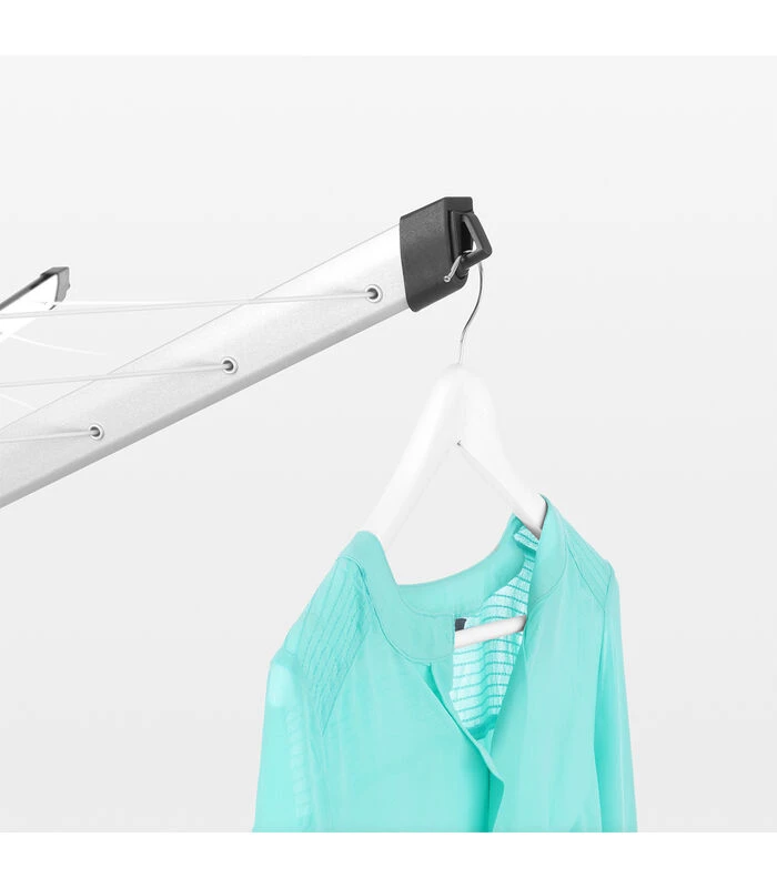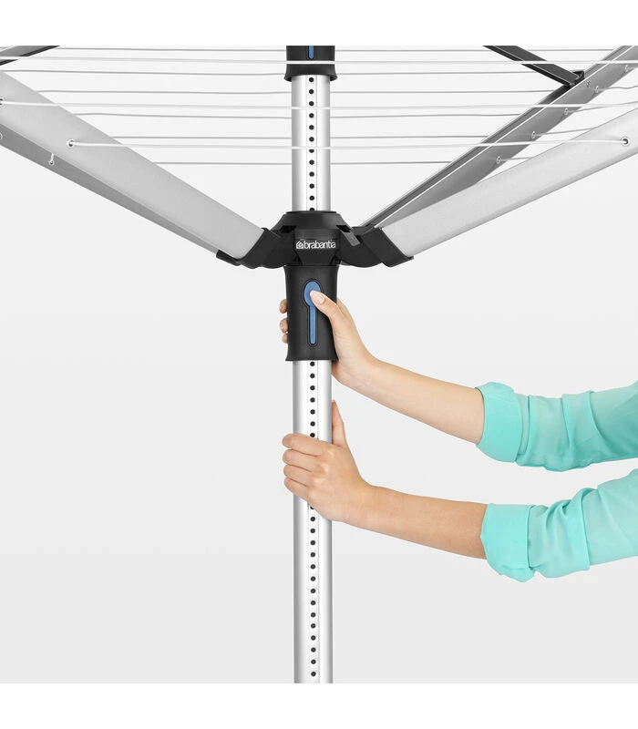 Met zijn soepel draaiende armen en ‘Easy–Lift’ systeem voor ultralichte bediening, kun je met de Brabantia Lift–O–Matic Advance droogmolen makkelijk werken zonder je wasmand te verplaatsen. Stel de droger gewoon in op je ideale werkhoogte (149 – 197 cm) en geef er een draai aan. Deze powerlifter heeft extra kwaliteit, UV–bestendige antislip waslijnen en gaten in de armen voor kleerhangers. Mooi en makkelijk!