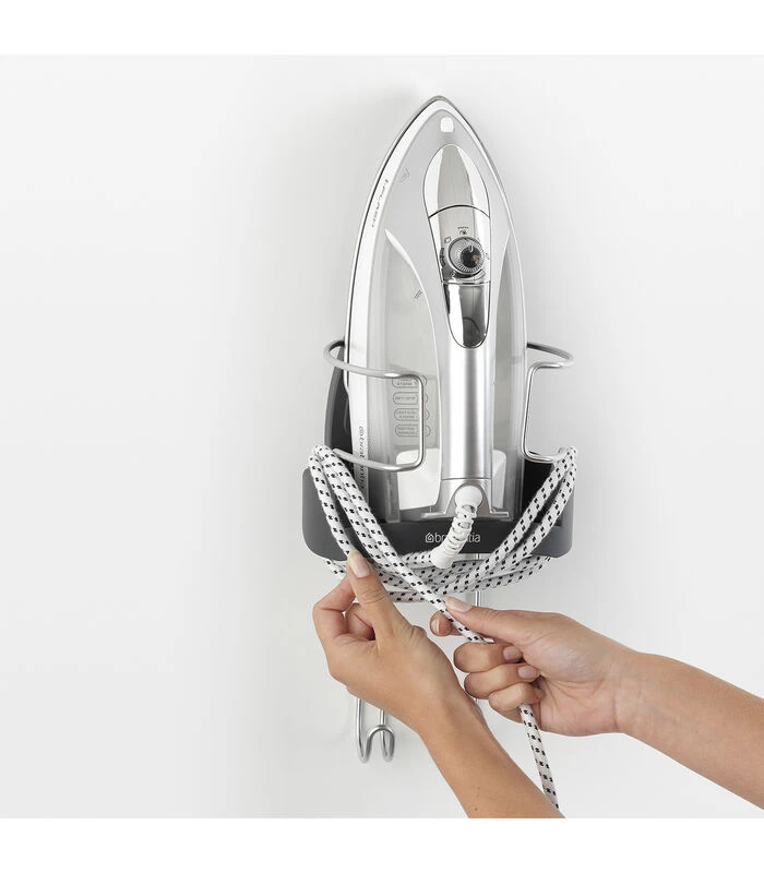 Klaar met strijken? Laat je strijkijzer niet afkoelen op je strijkplank, maar berg alles snel en veilig op met de strijksethouder van Brabantia. Gemaakt van hittebestendige materialen, dus eerst afkoelen hoeft niet. Zet je hete strijkijzer vast, rol het snoer op en hang de strijkplank aan de stevige haak. Veilig voor kleine handjes, netjes en opgeruimd in een mum van tijd.