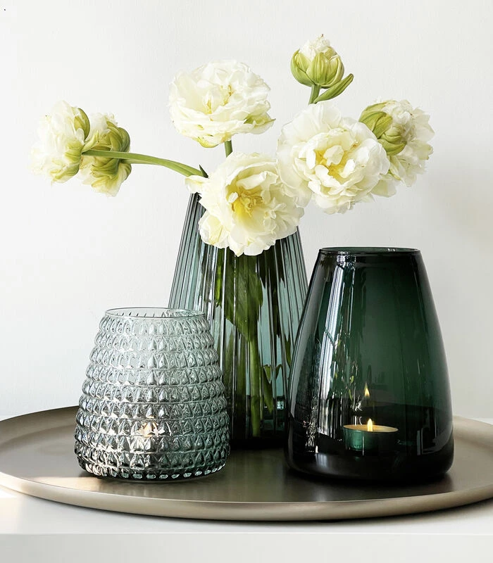 Een vaas komt altijd van pas, niet waar? De Dim vazen zijn gemaakt uit mondgeblazen glas, vaatwasser safe. Zijn neutrale kleuren zorgen ervoor dat alle bloemen mooi zullen uitkomen. Hij is verkrijgbaar in drie verschillende soorten glasstructuur. Zo kun je zelf kiezen of je voor basic wilt gaan of voor de net wat meer uitgesproken variant. Bloemen of kaarsen, deze vazen zullen uw interieur altijd oplichten.