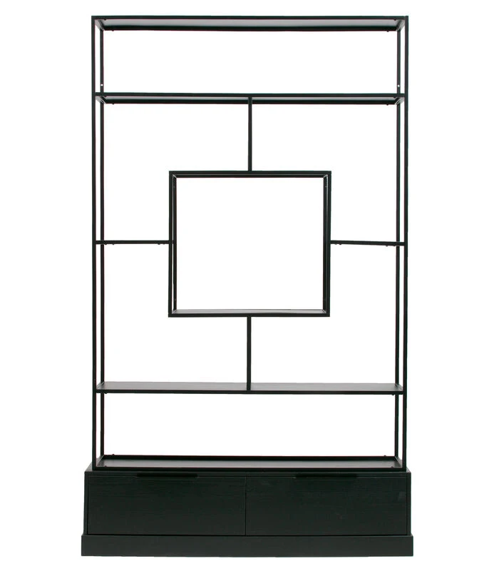 WOOOD Exclusive Fons Vakkenkast 126x204x38 cm (bxhxd) is een trendy en eigentijdse kast voor zowel in de woonkamer als op een slaap/werkkamer. De vakkenkast Fons, van het merk WOOOD Exclusive, is gemaakt van een metalen buisframe, zwart gelakt, gecombineerd met twee zwart gelakte grenen geschuurde lades. In het midden bevindt zich een groot, vierkant, vak waar je een echte eyecatcher kunt plaatsen! Je kunt de kast Fons aan de wand bevestigen of als roomdivider plaatsen. Artikelkenmerken