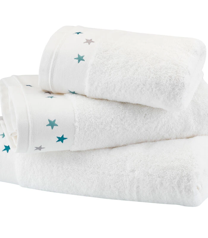 Premium badhanddoek van langvezelig gekamd parelmoer katoen (600 g / m²). Nette afwerking dankzij de grote moderne lat en fijn grijs en laguneblauw sterborduursel. Verkrijgbaar in verschillende maten: Handdoek: 50×100 cm. Douchebak: 70×140 cm. Badlaken: 100×150 cm. Voordelen: Zachte, zachte en ultra–absorberende spons 100% gekamd katoen lange vezels 600 g / m² voor maximale zachtheid en weerstand. Elegant en eigentijds geborduurd model. Al onze producten zijn OEKO–TEX gecertificeerd.