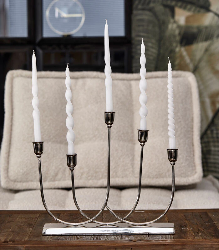 De Chateau d’Eau kaarsenstandaard heeft maar liefst vijf armen. Deze kaarsenstandaard van zacht glanzend aluminium is een sieraad op tafel of elders in huis. De kaarshouders hebben elk een klein randje, waardoor eventueel druipend kaarsvet niet over de standaard spettert. Alle dinerkaarsen van Rivièra Maison passen hierin.