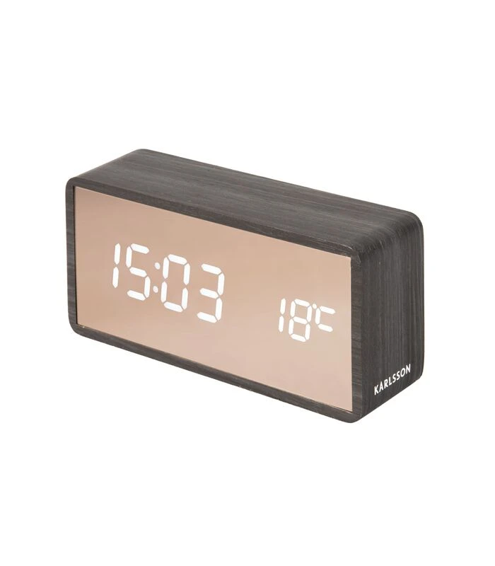 Uit de veren! De Copper Mirror wekker van Karlsson wekt je volledig in stijl. De strakke en moderne led–wekker is gemaakt van ABS. Zijn leuke houtlook frame en koperen spiegelfrontje zorgen ervoor dat de wekker op elk nachtkastje past. En je kunt direct kijken of je daadwerkelijk een schoonheidsslaapje hebt gehad. De Copper Mirror wekker van Karlsson is verkrijgbaar in de kleuren black en dark wood.