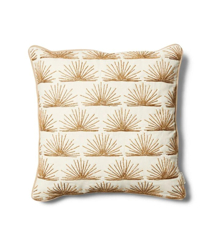 Via de blinde ritssluiting aan de onderzijde plaats je eenvoudig een binnenkussen van 50 x 50 centimeter in de RM Nerissa Pillow Cover 50×50. De kussenhoes van katoen in gebroken wit is rijkelijk versierd met glanzende en matte kralen die samen een patroon van een gouden zonsopkomst vormen. De achterkant van de hoes is effen. Dit kussensloop is gemaakt van 100% katoen.