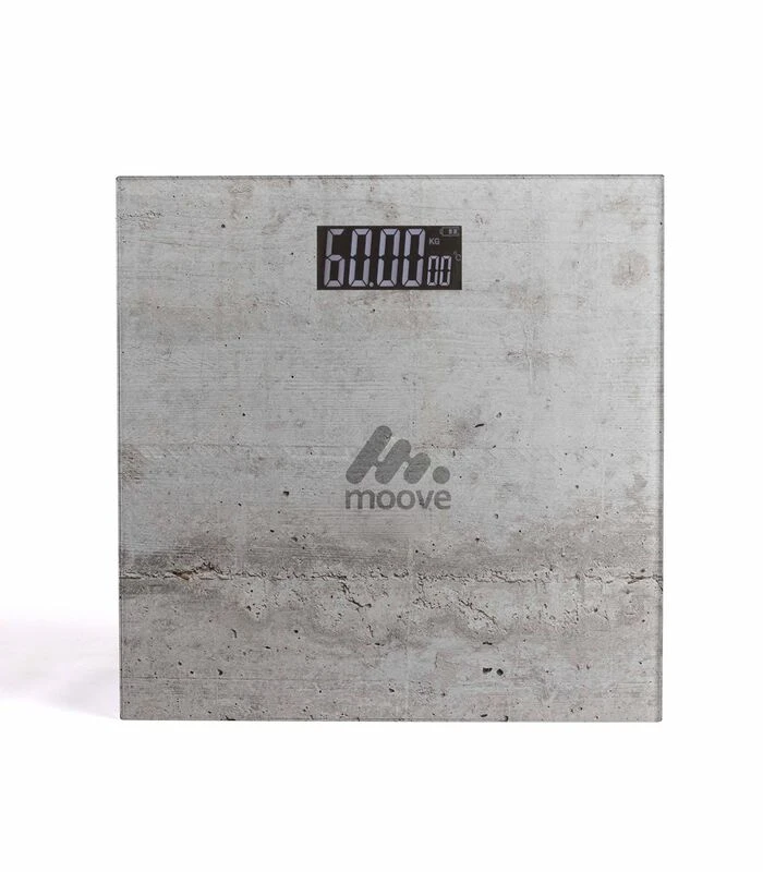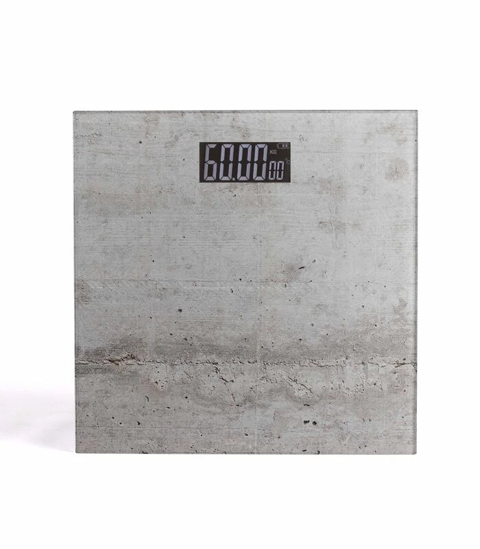 Personenweegschaal. Betonnen ontwerp. Glazen platform tot 180 kg. Opstellen tot op 100 g. Automatische aan–/uitschakelaar, indicator batterij bijna leeg.
