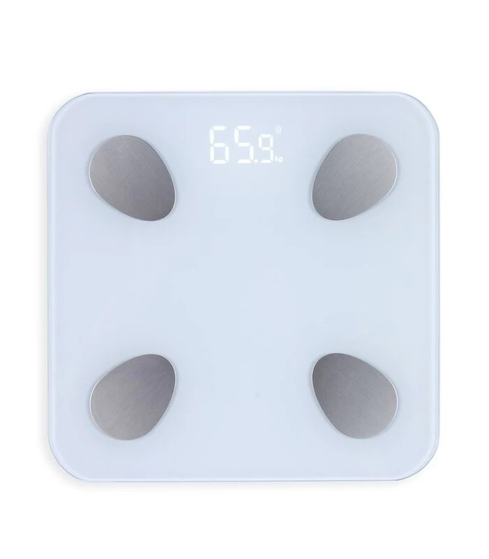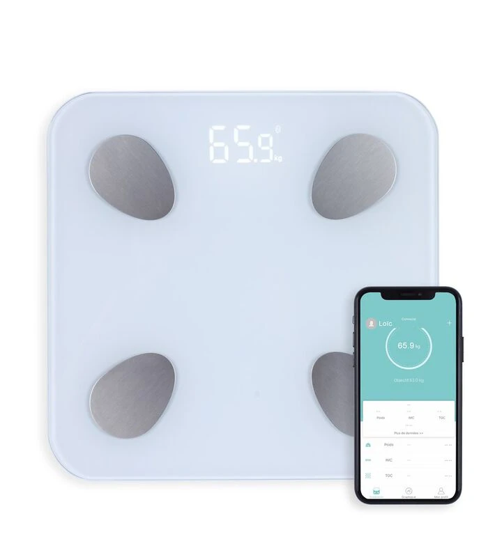 Volg en noteer uw gewicht met een smartphone– en tablet–app. 13 metingen van het lichaam (BMI, BMR, lichaamsvetmassa, botmassa, waterlichaamsmassa, etc.). Platform van gehard glas. Gewicht tot 180 kg, schaalverdeling elke 100 g. LED–scherm. Auto aan–/uitschakelen stroom, indicator batterij bijna leeg.