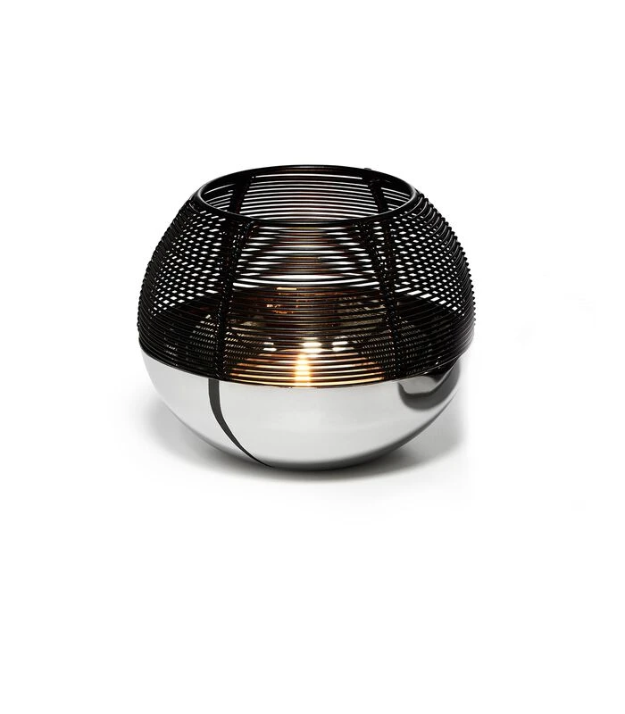 Wanneer de LUNA theelichthouder van PHILIPPI brand is het een schouwspel van schaduwen. De bovenzijde van zwart draadstaal laat tussen de draden door het kaarslicht schijnen en geeft een prachtig effect, met de basis van hoogglanzend nikkel in combinatie met het zwarte staaldraad krijgt de LUNA een industrieel uiterlijk.