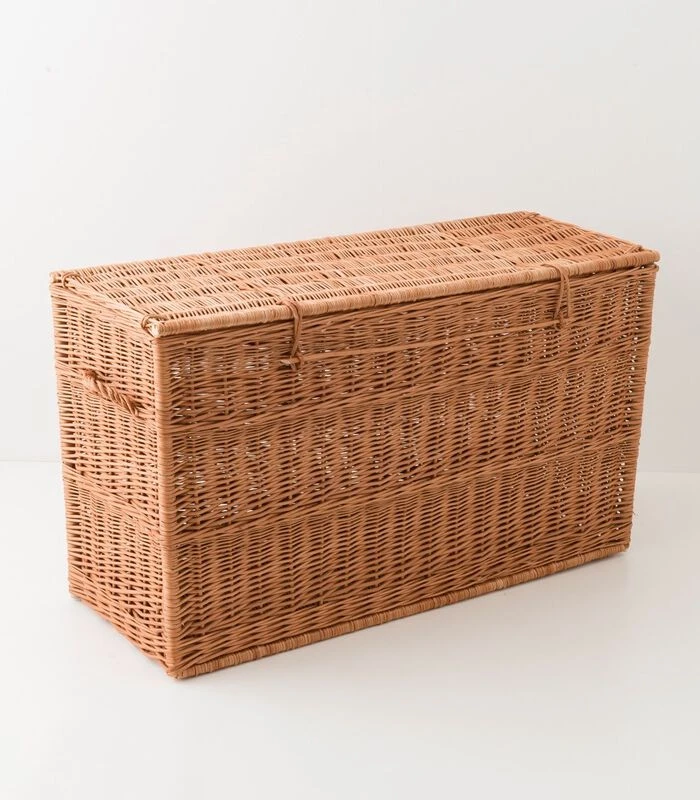 Totale afmetingen: hoogte 60 x breedte 100 (zonder handgrepen) x diepte 42. Gewicht 6,0 kg. Geheel geweven in naturel buff wicker (geen vernis of beits). Gemaakt in Europa.