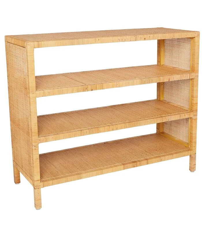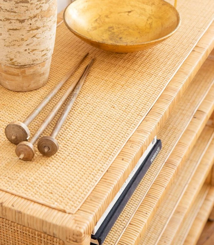 Wij hebben deze plank gemaakt op een massief houten structuur. Het riet is aan de zijkanten opengewerkt om het licht naar binnen te laten vallen, zoals bij een moucharrabieh. Het is gesloten en gevlochten op een houten plank aan de bovenkant en op de tussenplanken, zodat u er kleine voorwerpen in kunt leggen. In een badkamer, een entree, een keuken, een slaapkamer, en naast zijn praktisch nut, zal het door zijn blondheid en zijn natuurlijk aspect, de warmte brengen die soms ontbreekt in onze hedendaagse interieurs. Van KOK Maison, rotan specialist sinds 1920.
