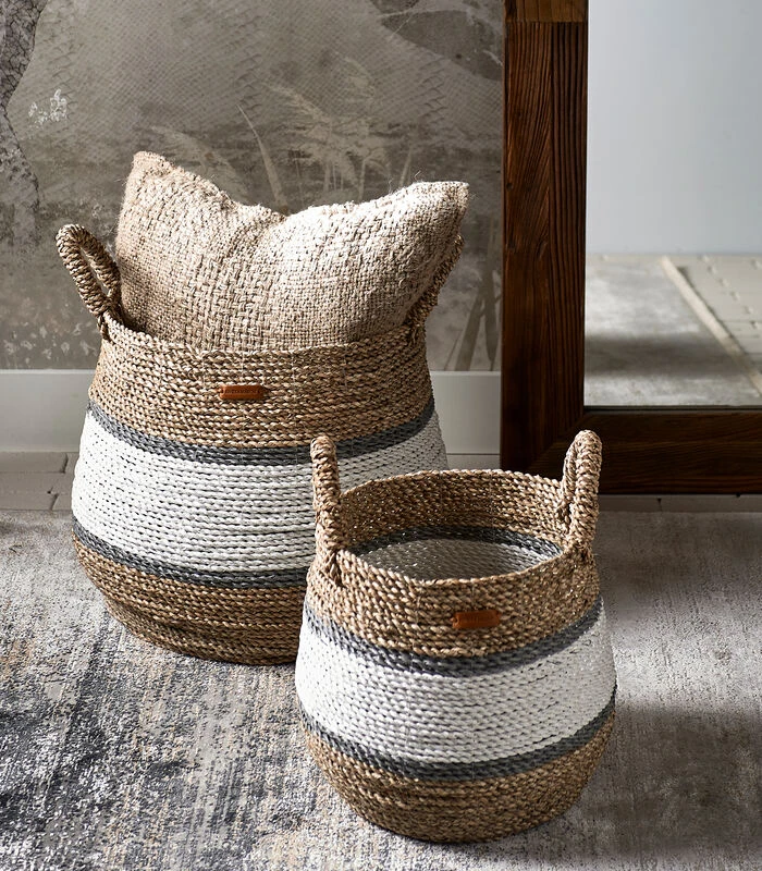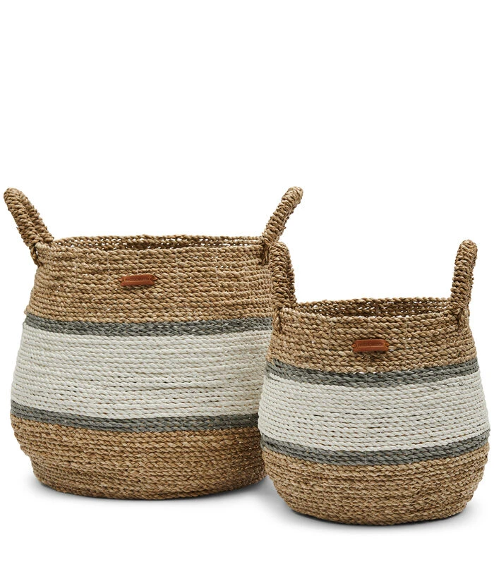 De Ocean Breeze Basket Set of 2 pieces is een set van twee opbergmanden in twee verschillende formaten. De grote en middelgrote mand zijn gemaakt van zeegras en raffia, deels geverfd in de zomerse tinten wit en grijs. De opbergmanden met handvatten zijn decoratief, maar ook erg praktisch voor ieder vertrek in huis.
