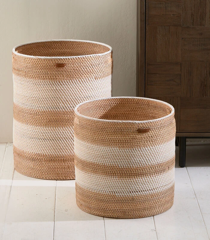 Dit een set bestaande uit twee grote manden uit de Crystal Bay–serie. Deze manden zijn van pitriet en rattan, dat met de hand gevlochten is in een wit met naturel streeppatroon. De manden passen in elkaar, zo kan je ze gezamenlijk opbergen. Verkrijgbaar in verschillende maten en uitvoeringen.