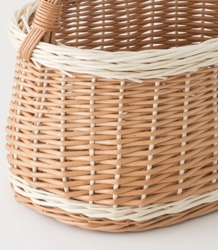 De met twee vlechten van gebleekt riet beklede boodschappenmand is een ‘gondel’–mand, d.w.z. met het hengsel in de lengterichting. Het exemplaar dat wij hier voorstellen is tamelijk compact, smal en hoog, het belemmert de doorgang tussen de takken van het kreupelhout niet. Van KOK Maison, rotan specialist sinds 1920.