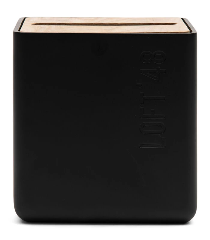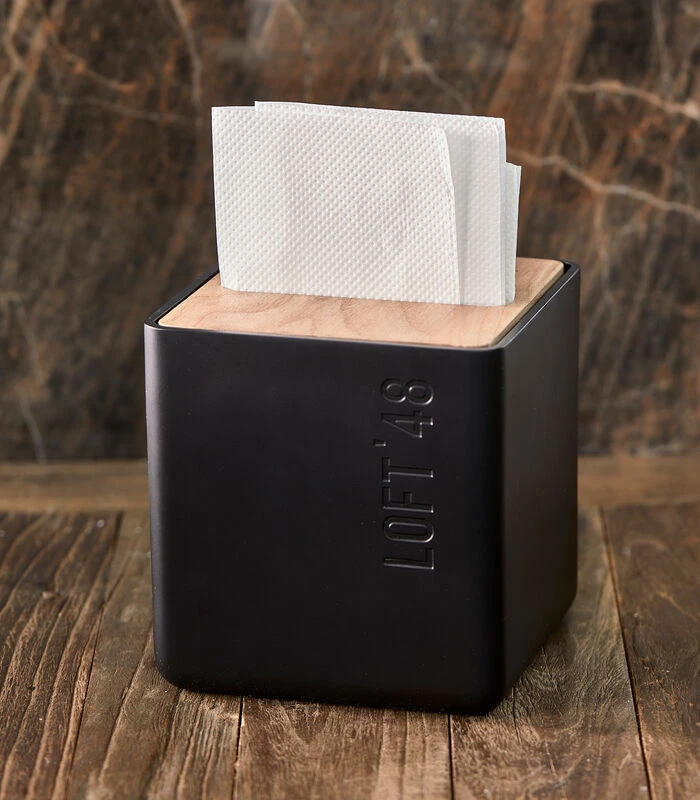 Houd je van zwart,dan wil je deze Loft’48 Tissue box in je badkamer hebben. De chique uitstraling met de naam in verdiept reliëf doet wat met je,telkens als je je handen wast. De tissuebox is gemaakt van hars. In deze serie zit ook nog een bijpassende drinkbeker en zeeppompje.
