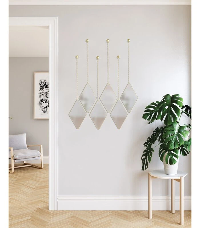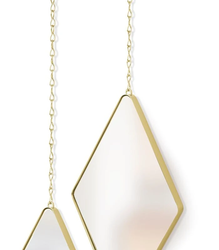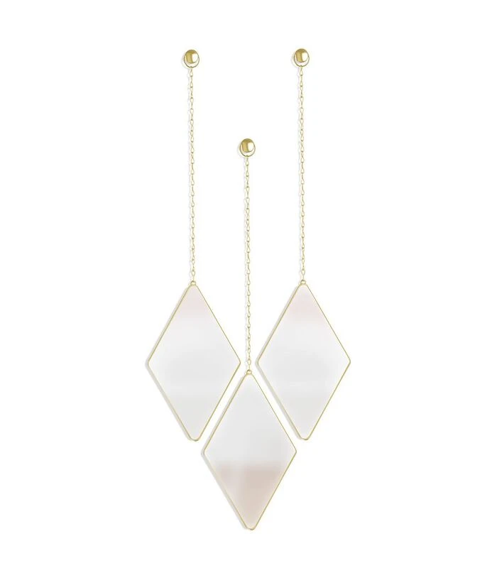 Dit trio diamantvormige spiegels is geïnspireerd op argylepatronen en kan los of in diverse combinaties worden opgehangen. Iedere spiegel is 28,5 x 18 x 1 cm groot en hangt aan een ketting van 38 cm. Verkocht als een set van drie, al het bevestigingsmateriaal is inbegrepen. De bevestigingsmaterialen zijn zelf ook uiterst decoratief: de spiegels hangen met een ketting aan een prachtige ronde knop.