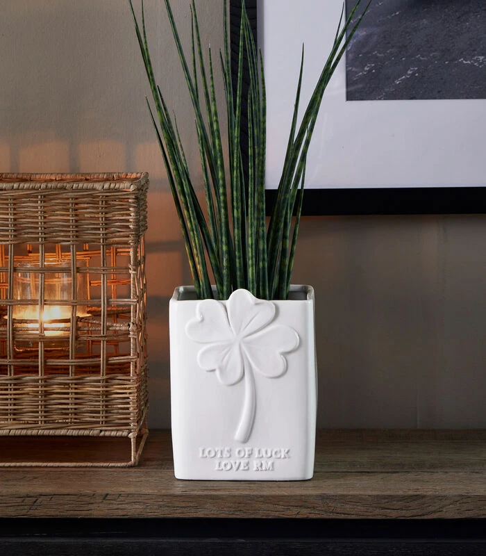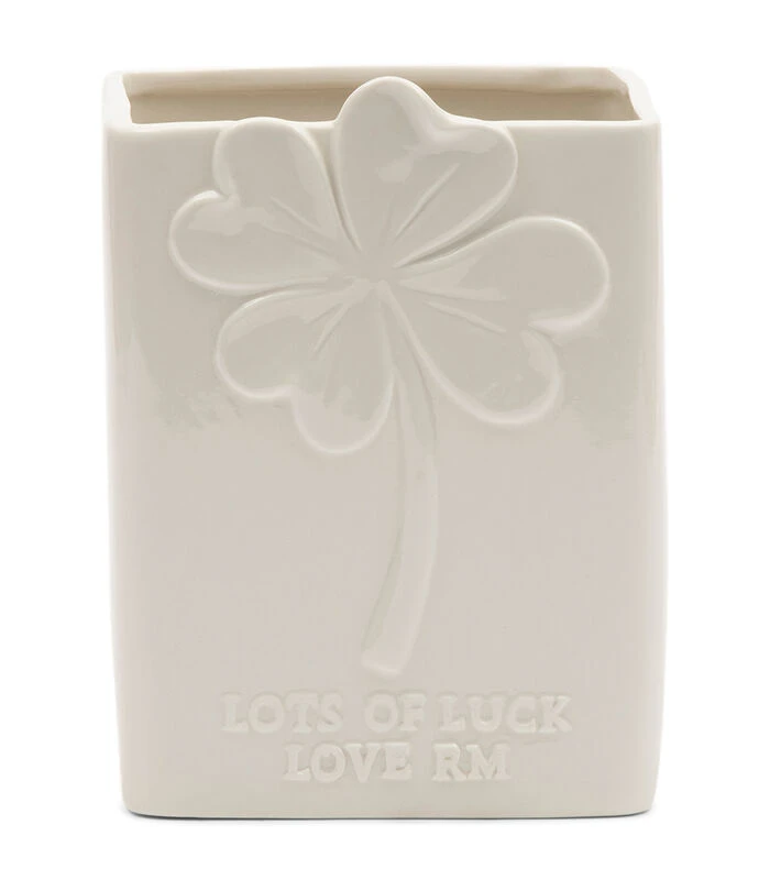 De RM Lucky Clover Vase is een rechthoekige bloemenvaas van keramiek. De vaas is versierd met een klavertje vier en de tekst ‘Lots Of Luck, Love RM’. Het is dus ook leuk om deze vaas cadeau te geven aan iemand die een beetje extra geluk kan gebruiken.