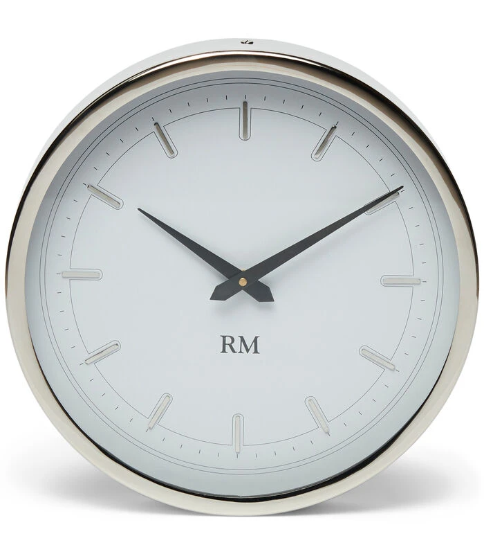 De RM Yara Clock is een ronde wandklok met een zilverkleurige, metalen rand. De uren staan aangegeven met zilverkleurige streepjes. De wijzers zijn zwart, net als de subtiele tekst ‘RM’. Het enige goudkleurige detail is het bevestigingsknopje voor de wijzers, in het midden van de klok.