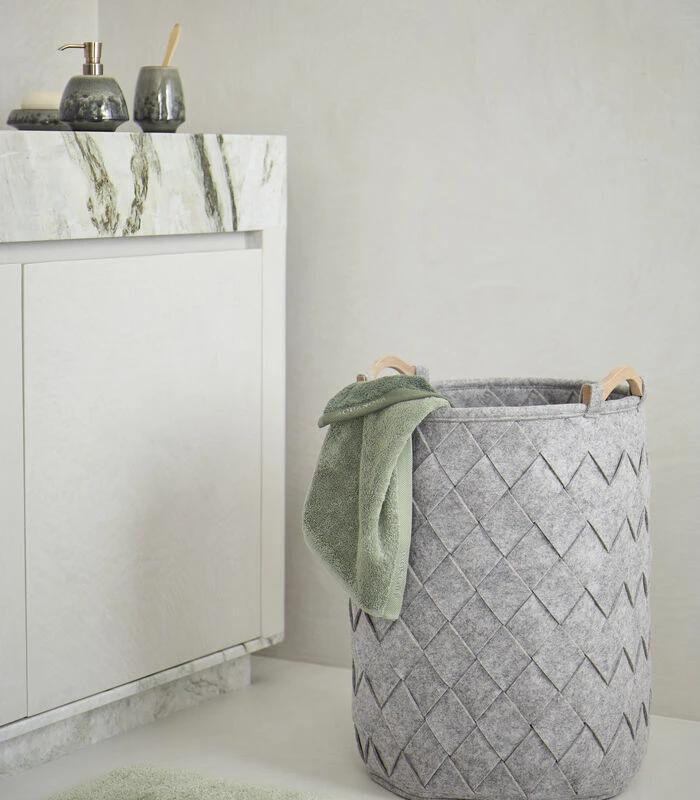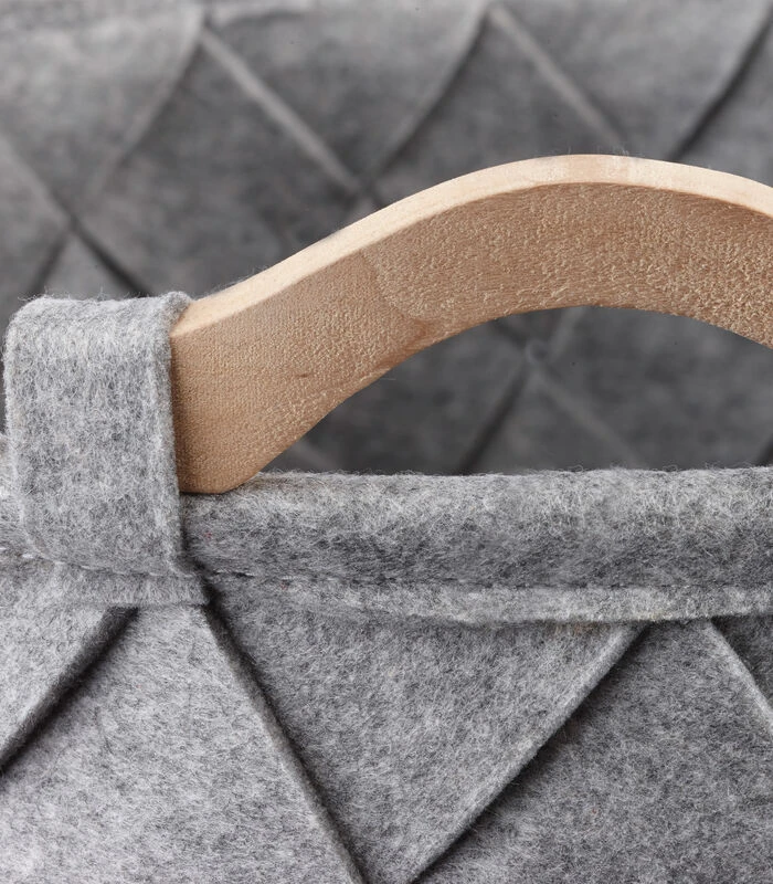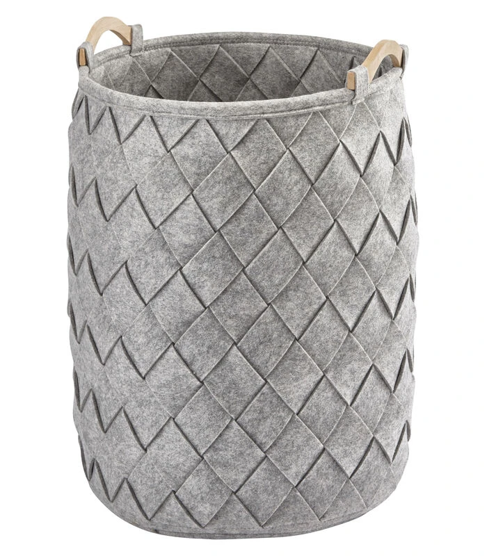 Wasmand gemaakt van gevlochten stroken polyester vilt (dikte 4 mm) met houten handvaten.