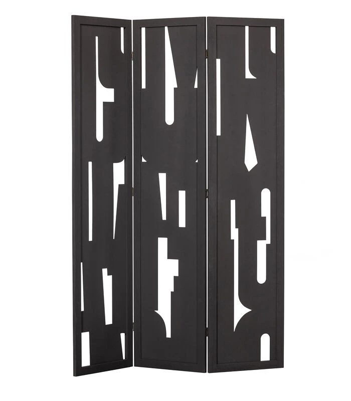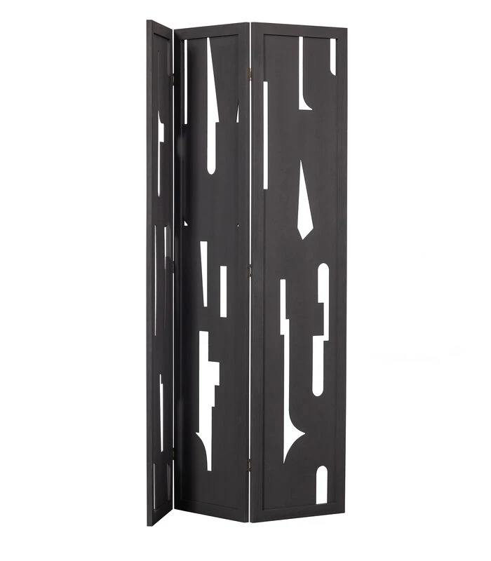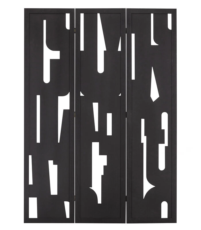 Kamerscherm Merel komt uit de collectie van het Nederlandse interieurmerk WOOOD en biedt een stijlvolle oplossing om de woonruimte subtiel te verdelen of af te schermen. Het kamerscherm is gemaakt van MDF met een matzwarte afwerking. Het grafische patroon in de drie panelen zorgen voor een mooi diepte–effect en bieden redelijk wat privacy.