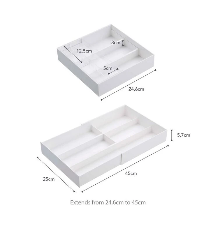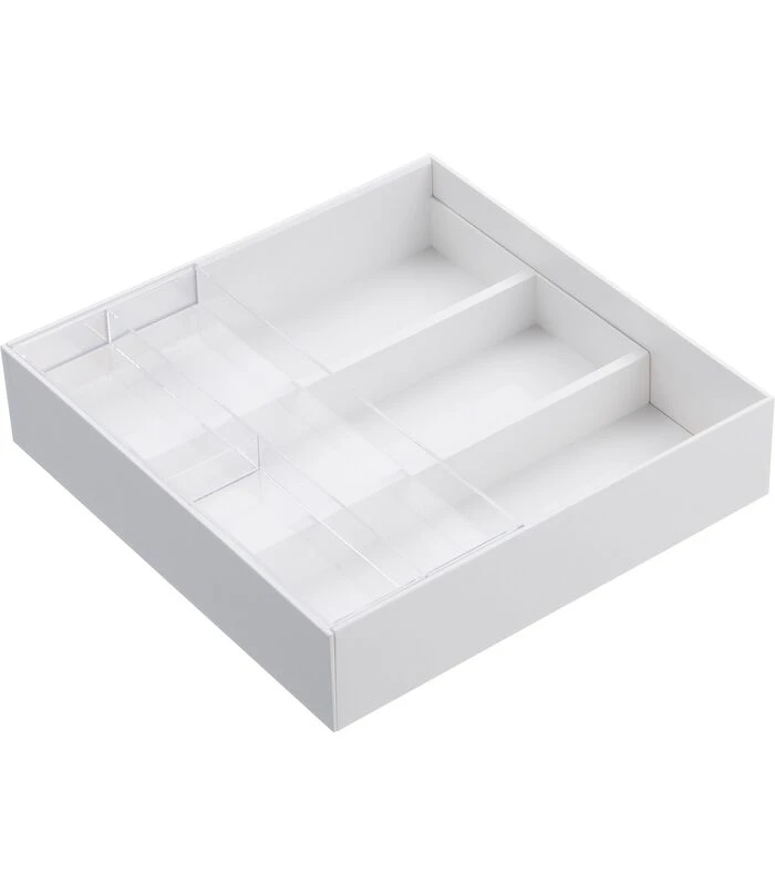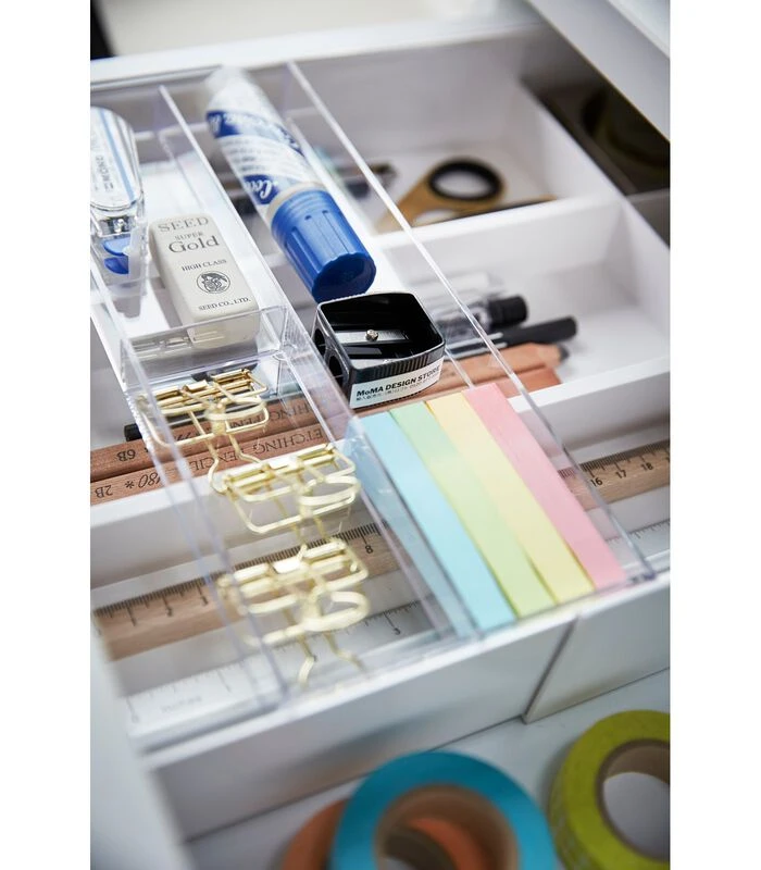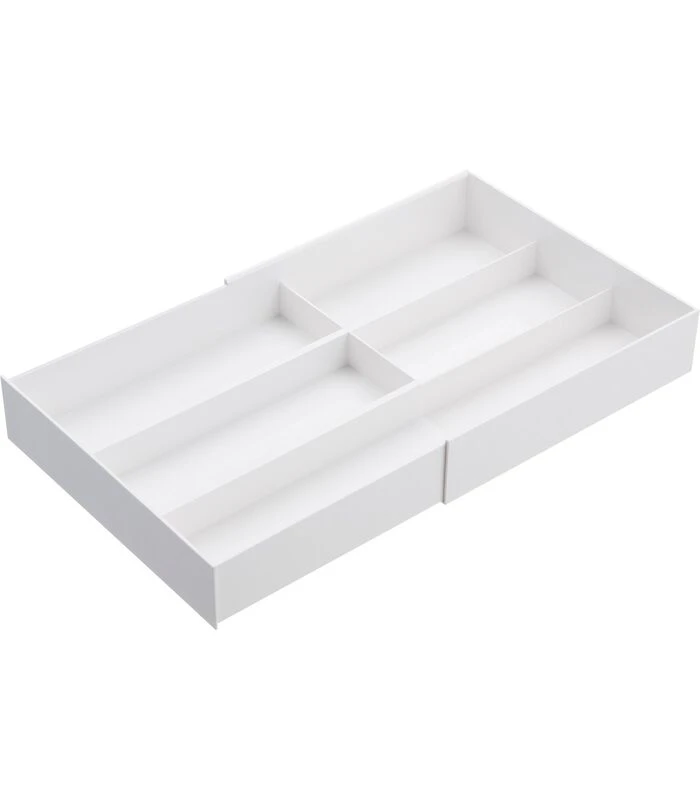 Deze handige uitschuifbare oranizer van Yamazaki past nagenoeg in iedere bureau lade. De vijf ruime basiscompartimenten kunnen worden uitgebreid met een acryllade voor extra opbergruimte.
