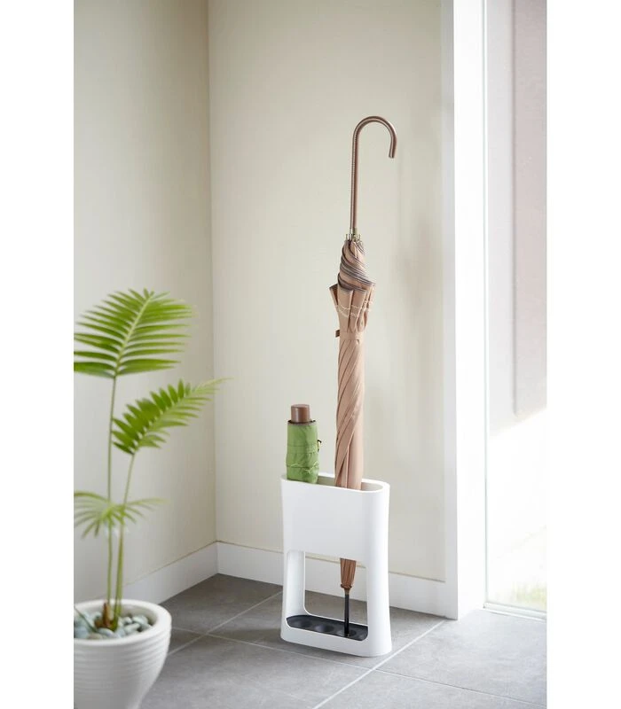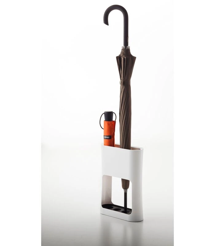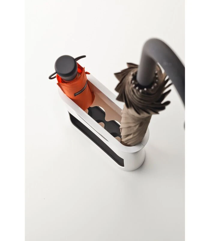 Deze kleine paraplu standaard van Yamazaki biedt plaats aan maximaal 4 paraplu’s en past in nagenoeg iedere ruimte. Een slimme scheidingswand in het midden creëert een hoger platform voor kleinere paraplu’s terwijl er ook plaats is voor grote paraplu’s. De houder is ontworpen in Japan en gemaakt van staal.