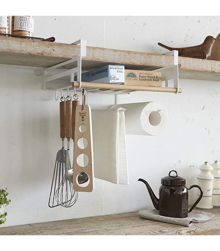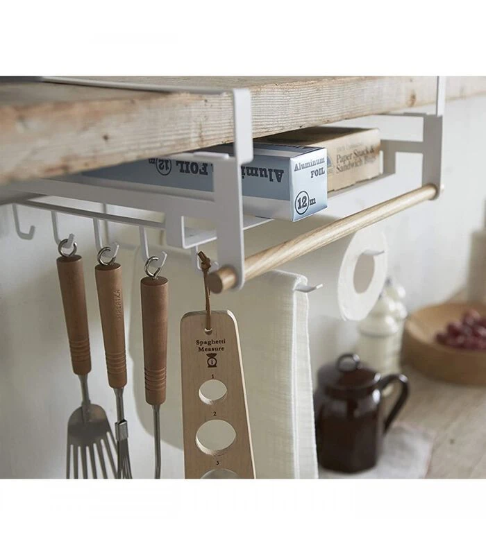 Dit multifunctionele keukenrek van Yamazaki kun je ophangen in je keuken en al je keuken benodigheden in opbergen. Het keukenrek heeft een houder voor een keukenrol, keukenhanddoek, en haken aan de zijkant om keukengerei aan op te hangen. Het bespaart ruimte, houdt uw keuken opgeruimd en past onder elke kast of plank. Gemaakt van staal en hout, ontworpen in Japan.