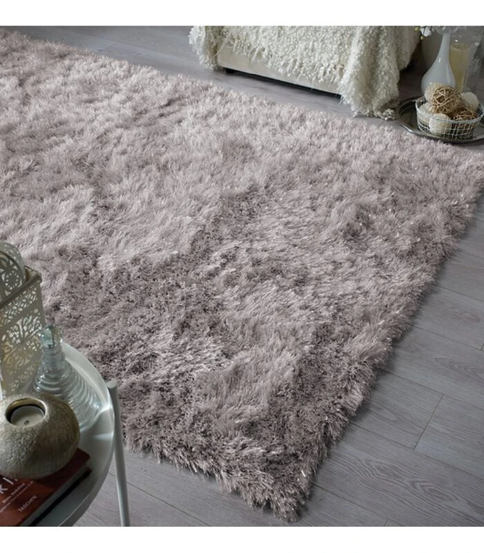 Het dikke en dunne zijdeachtige polyestergaren zorgt voor een ruig vloerkleed met extreem comfort. Met toegevoegde lurex–strengen voor een vleugje glamour.